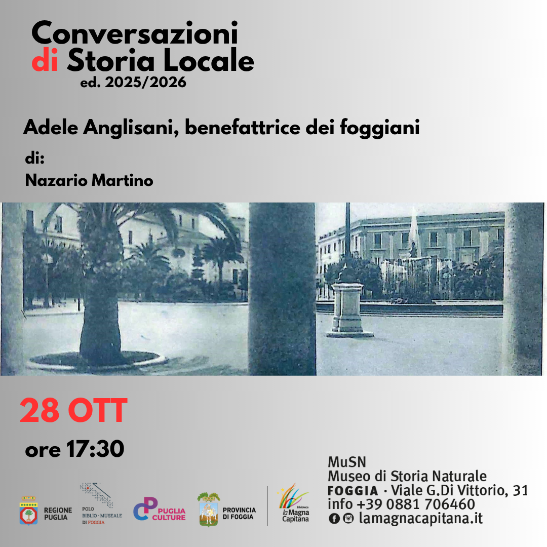 Si parte martedì 28 ottobre 2025 alle 17.30 nella Saletta Conferenze del Museo di Storia Naturale di Foggia con Adele Anglisani, benefattrice dei foggiani, a cura di Nazario Martino.
