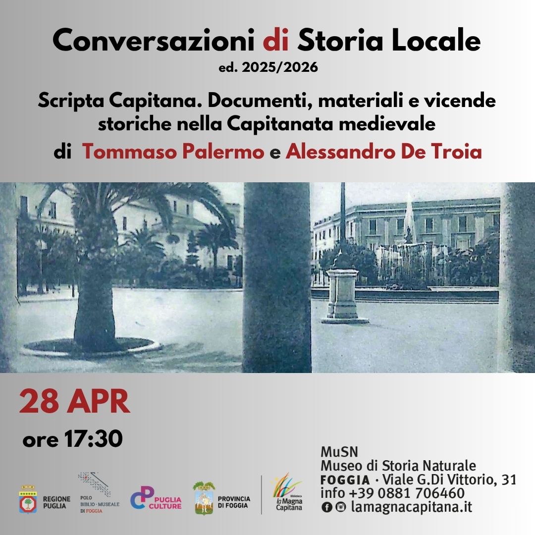 Martedì 28 aprile alle 17:30, nell'ambito del ciclo di Conversazioni di Storia Locale organizzato dalla sezione Fondi Speciali, si terrà l’incontro Scripta Capitana. Documenti, materiali e vicende storiche nella Capitanata medievale, a cura di Tommaso Palermo e Alessandro De Troia.