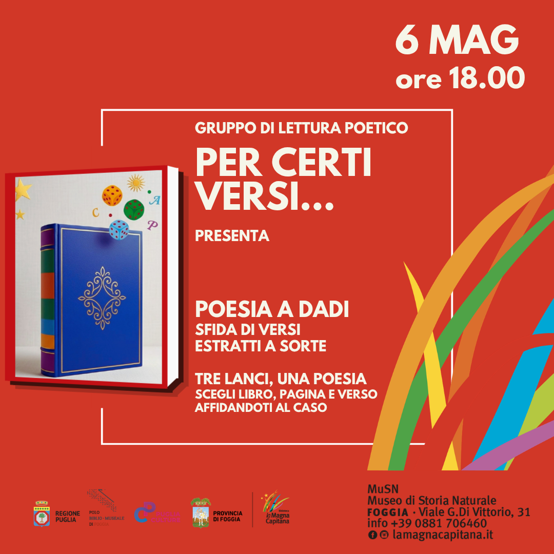 Poesia a dadi: una sfida di versi estratta a sorte è la proposta del gruppo di lettura poetico Per certi versi..., che torna a riunirsi mercoledì 6 maggio 2026, alle ore 18.00, nella Sala Darwin del Museo di Storia Naturale di Foggia, in viale Giuseppe Di Vittorio, 31.