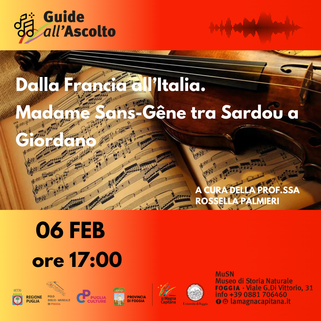 Venerdì 6 febbraio 2026, alle ore 17.00, nella Saletta Conferenze del Museo di Storia Naturale (viale Giuseppe Di Vittorio, 31), si terrà l’incontro Dalla Francia all’Italia. Madame Sans-Gêne da Sardou a Giordano, dedicato al celebre compositore foggiano Umberto Giordano, protagonista del verismo musicale.